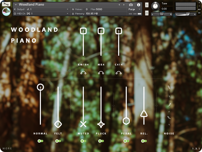 I recorded the Woodland Piano with seven microphones (three stereo set-ups shown in the walkthrough video) up close and with multiple articulations – normal, felt, muted, and plucked + release triggers and pedal sounds.